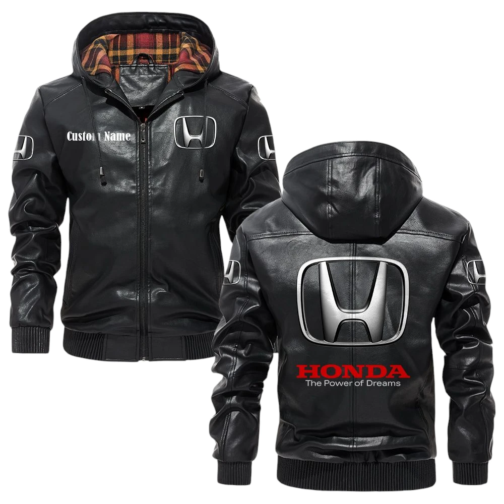 Honda Exclusive Logo Hooded Jacket PU Leather x Durable Windproof Warm Soft Checkered Lining, Custom Name HG010425Y47JHLCT3HON