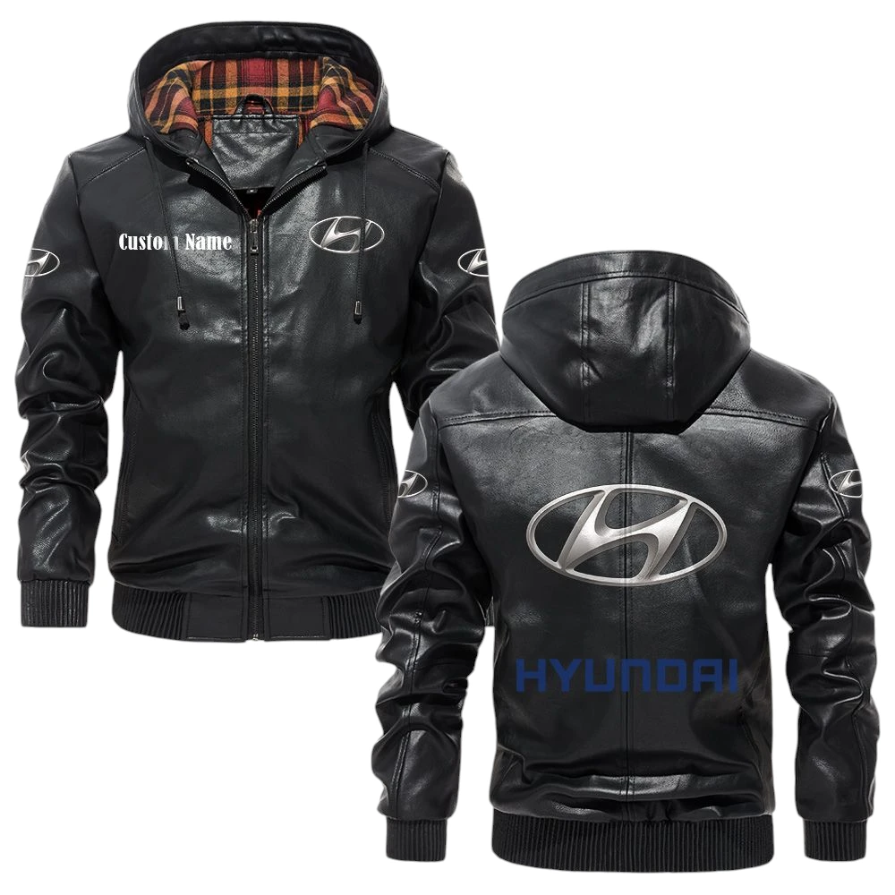 Hyundai Exclusive Logo Hooded Jacket PU Leather x Durable Windproof Warm Soft Checkered Lining, Custom Name HG010425Y47JHLCT1HYU
