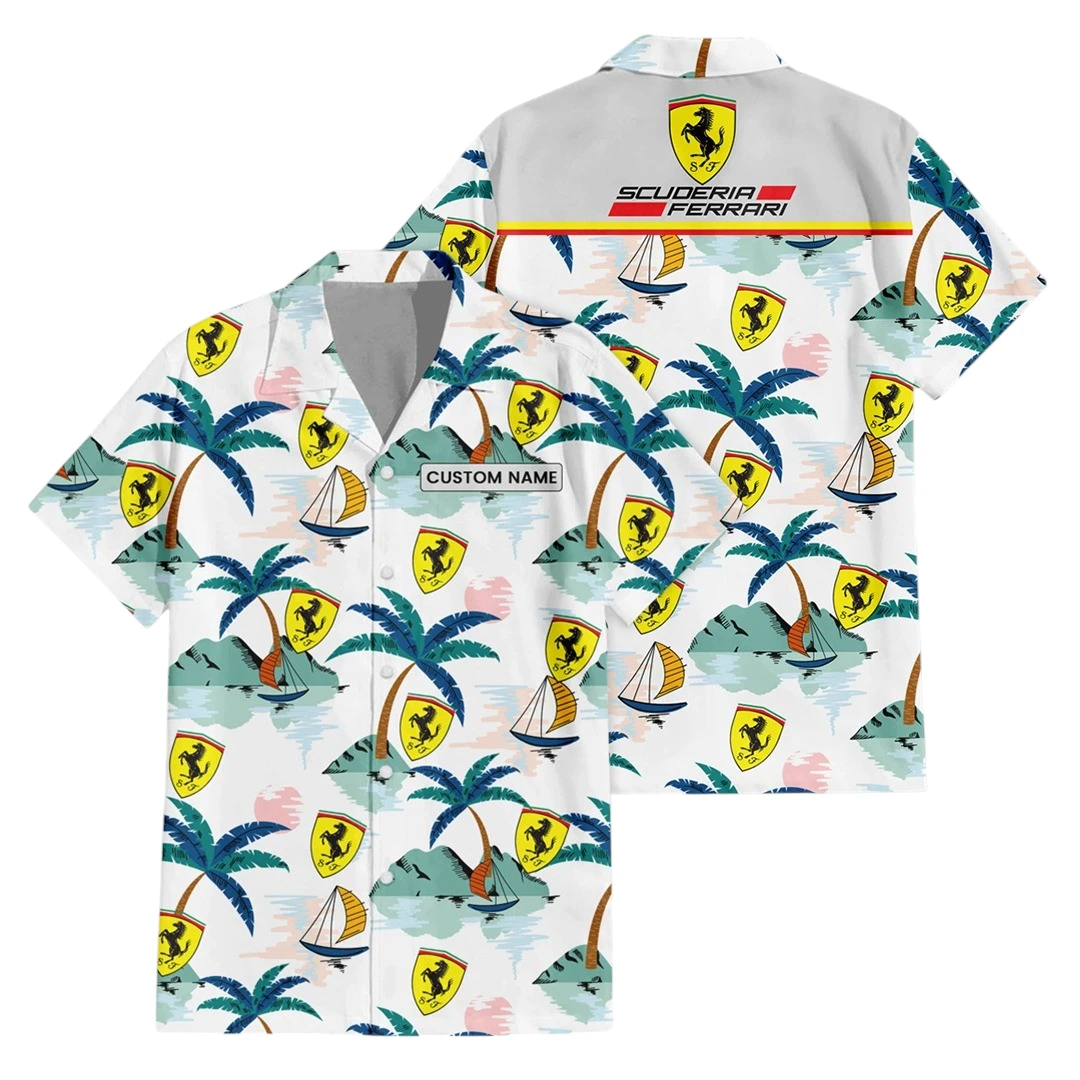 Scuderia Ferrari Exclusive Logo Button Up Hawaiian Shirt Tropical Landscape Pattern All-over Print, Custom Name HIDI210225Y7HWLS2SCF
