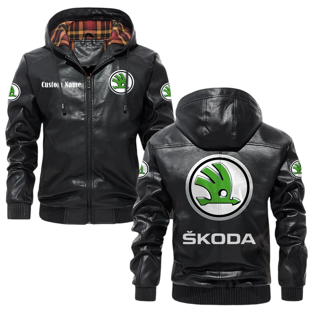 Skoda Exclusive Logo Hooded Jacket PU Leather x Durable Windproof Warm Soft Checkered Lining, Custom Name HG030425Y47JHLCT1SKO