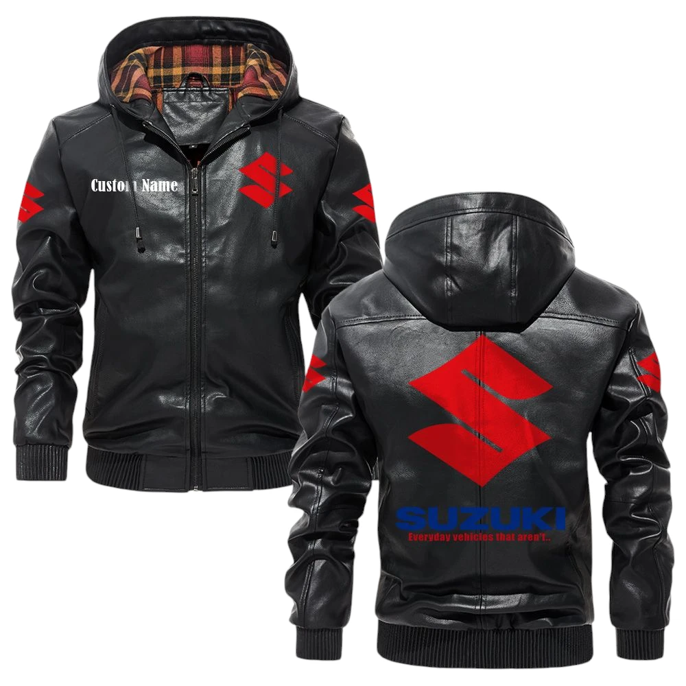 Suzuki Exclusive Logo Hooded Jacket PU Leather x Durable Windproof Warm Soft Checkered Lining, Custom Name HG030425Y47JHLCT2SUZ